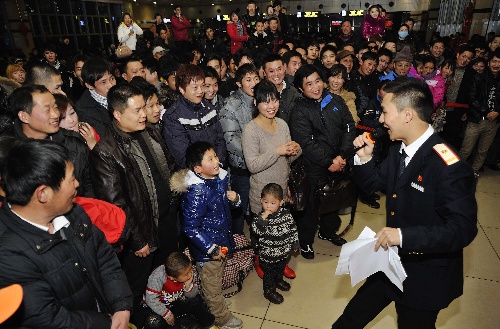 当日是农历除夕,上海铁路局上海站的部分职工和上海邦德学院的青年志愿者放弃与家人团聚的机会,在第七候车室内为当晚赶往安徽阜阳、亳州家乡过年的农民工兄弟姐妹们送上一台精彩的文艺演出,并为他们送上热腾腾的饺子,使搭乘除夕末班车回家的农民工倍感温暖。