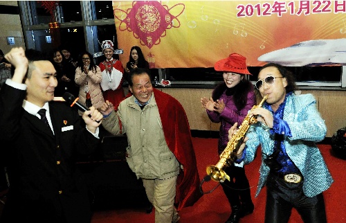 1月22日,在铁路上海站候车室内举行的“春晚”上,候车的几位农民工与铁路职工互动表演“西班牙斗牛士”。