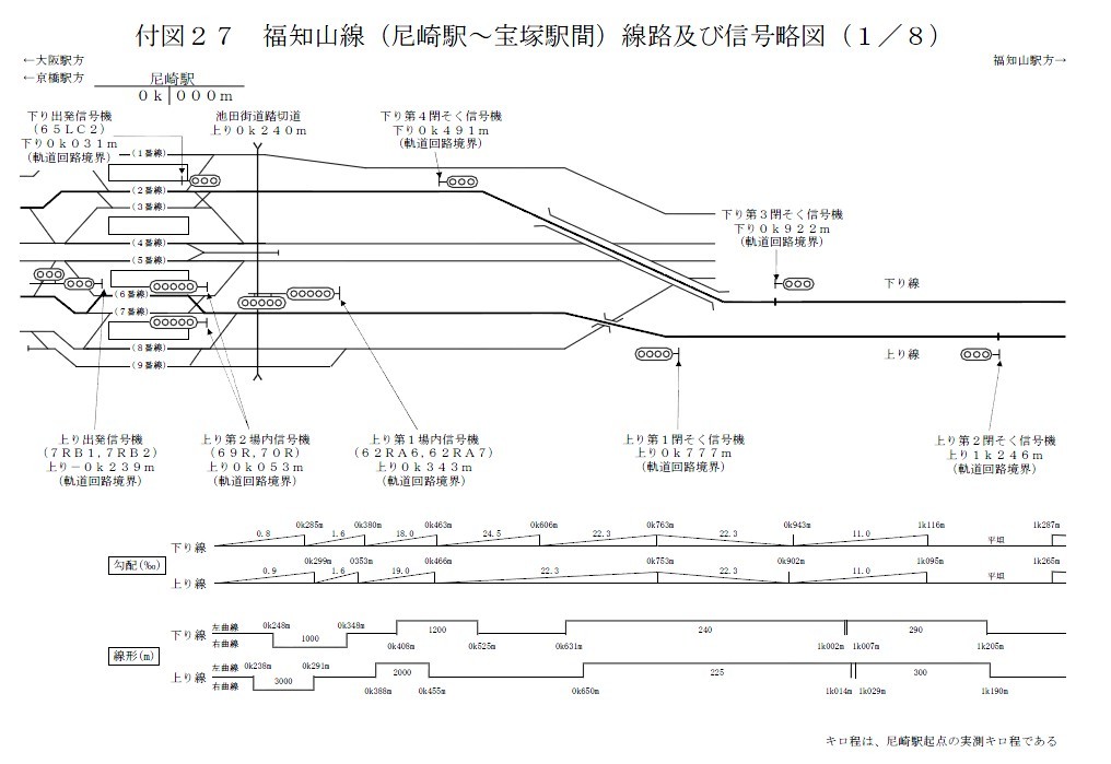 福之山线中山寺站~宝冢站间下行线上,和其它区间一样,在场内信号机上设置了SW远端功能。宝塚站下行场内信号机1RA2为R显示的时候,从下行17k426M处SW远端地上端子1RQ1传来需要确认的消息;下行出发信号机6R为R显示的时候,从下行17k981M处SW远端地上端子5 6RQ1传来需要确认的消息。