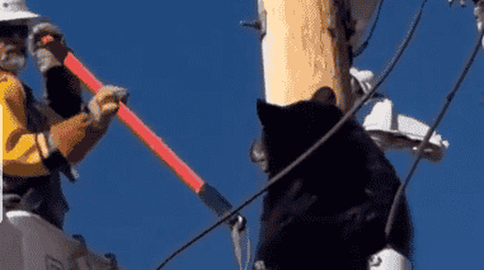 美国一黑熊爬上电线杆与线路工人周旋
