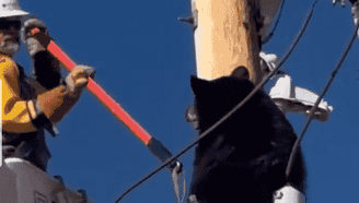 美国一黑熊爬上电线杆与线路工人周旋