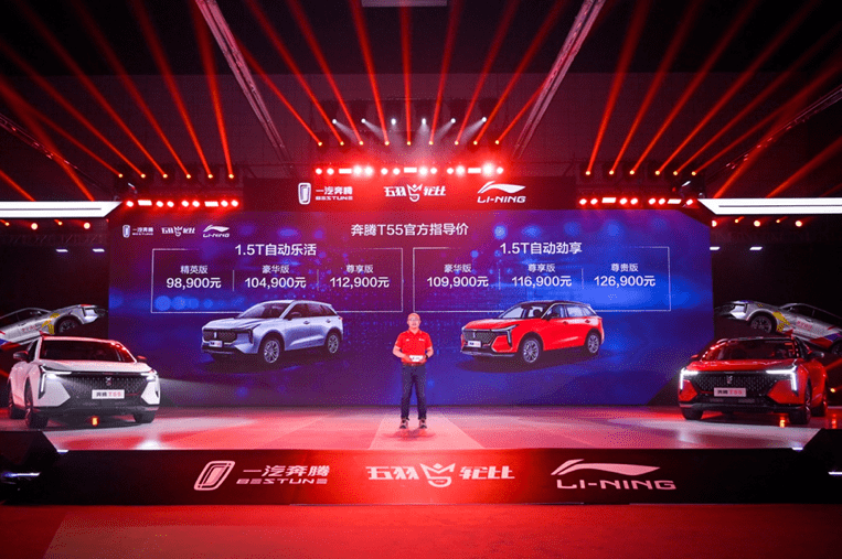 4月27日晚,位于北京通州的李宁中心充满了喜庆氛围,夜幕的笼罩下一片红色氛围灯围绕的奔腾T55熠熠生辉。没错,主角就是它。当晚,一汽奔腾T55全系产品上市发布会正式拉开帷幕,共带来了6款车型,官方指导价区间为9.89-12.69万元。此外,一汽奔腾与李宁品牌“五羽轮比”赛事合作正式启动,并为我们带来了奔腾T55李宁定制版车型。