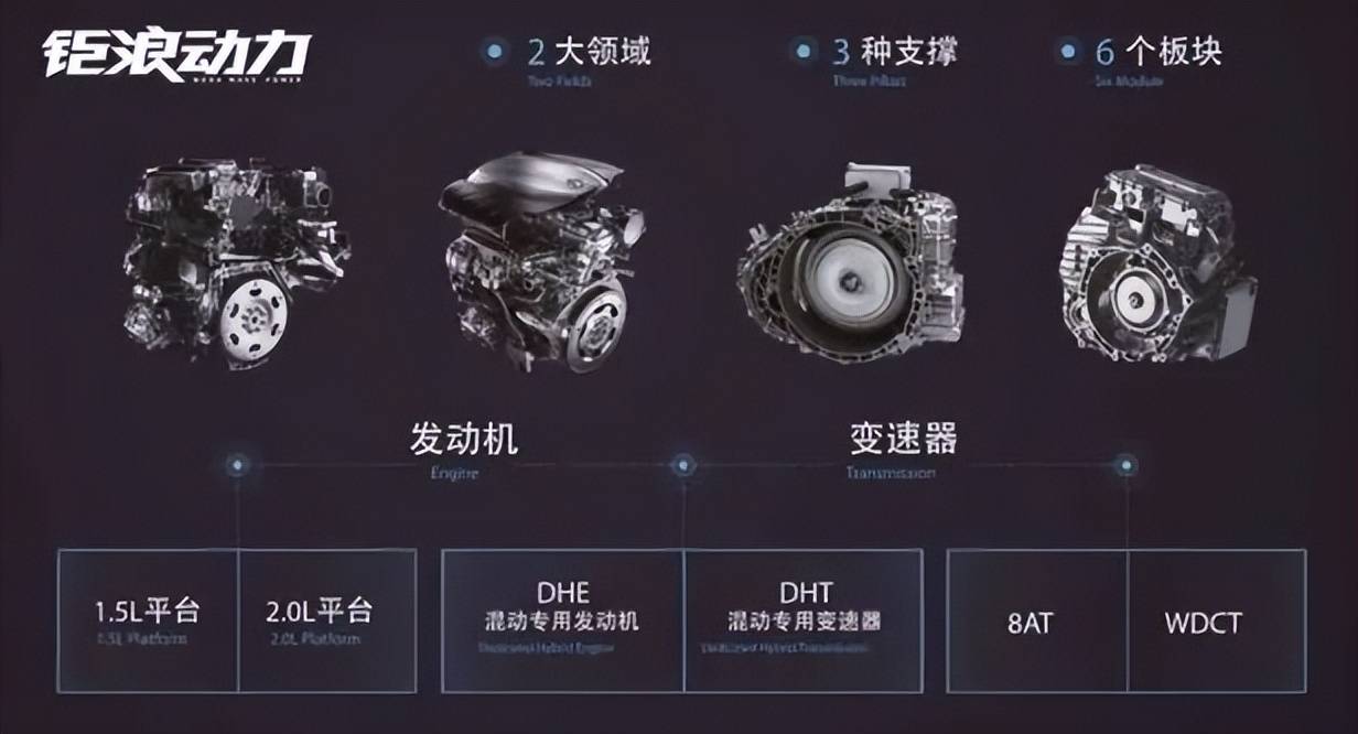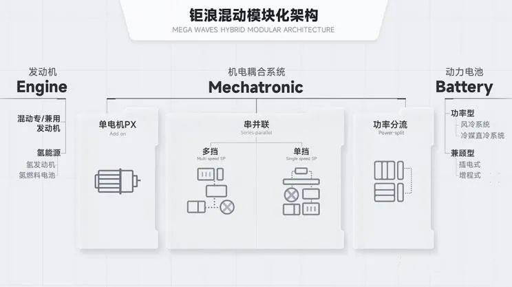 此后在2022年,广汽也实现了其基于双电机串并联结构开发的GMC 2.0混合动力系统。采用内燃机直驱传动齿轮组2挡+电驱动单挡减速器结构。并在广汽传祺影豹和影酷上实现量产装车。而从广汽公布的旗下动力总成平台钜浪动力的混动模块化架构来看,其双电机串并联混联式变速箱,既有单挡结构(此前已在2020年4月上市的传祺GS4 PHEV上实现量产装车),也有多挡结构。