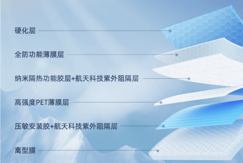 胜利车膜合作的航天山由研发中心早在2014年便已将紫外阻隔率提升至99.65%,此次加持航天技术成果,依托航天纳米技术在高强度PET薄膜层基层上下均增设独立航天科技紫外阻隔层,性能稳定,双重保护,将紫外阻隔寿命提升至26000小时以上,3年内紫外线阻隔衰减能控制在0.4%以内。