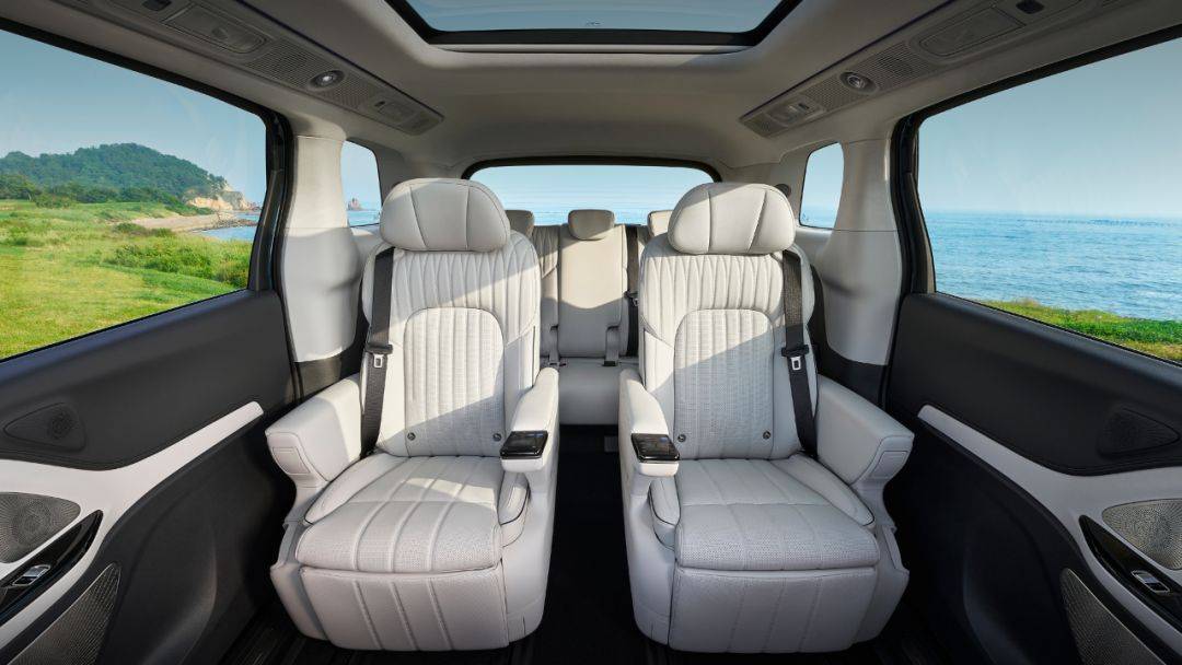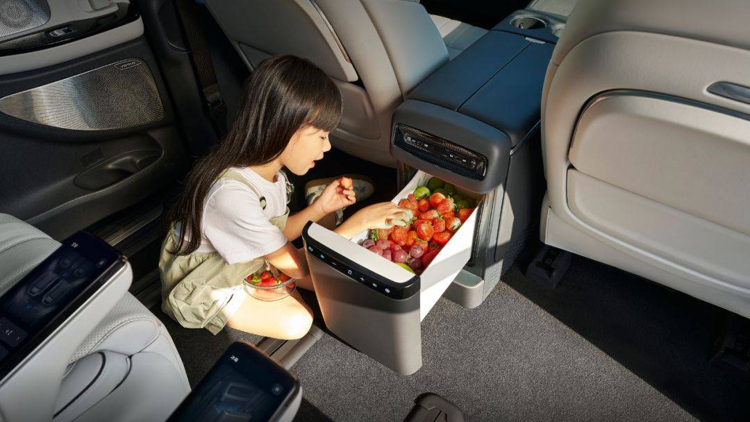其他区别上,中排座椅的体验是没有区别的,加热通风按摩一应俱全,座椅规格也一样,但32万的前排座椅就没了按摩功能了,另外这个版本还没有车内氛围灯。哦对了,32万的版本也没有车载冰箱。