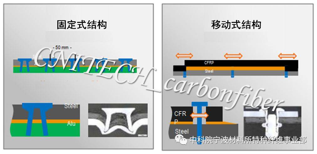 在CFRP与金属钢、铝等结构连接时,宝马公司设计出来固定式、移动式两种结构(图5)。