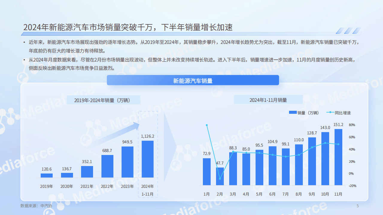 - 市场销量增长加速:2024年新能源汽车市场销量突破千万,下半年增长加速,显示市场潜力巨大但竞争激烈。