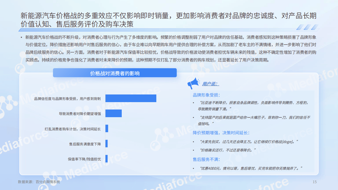 - 价格战影响购车决策:消费者对品牌信任度、忠诚度受影响,决策时间延长,对售后服务满意度下降,保值率担忧增加。大部分用户对价格敏感,期待降价并希望减少波动,高线城市用户讨论更积极,下沉市场对性价比车型需求高。