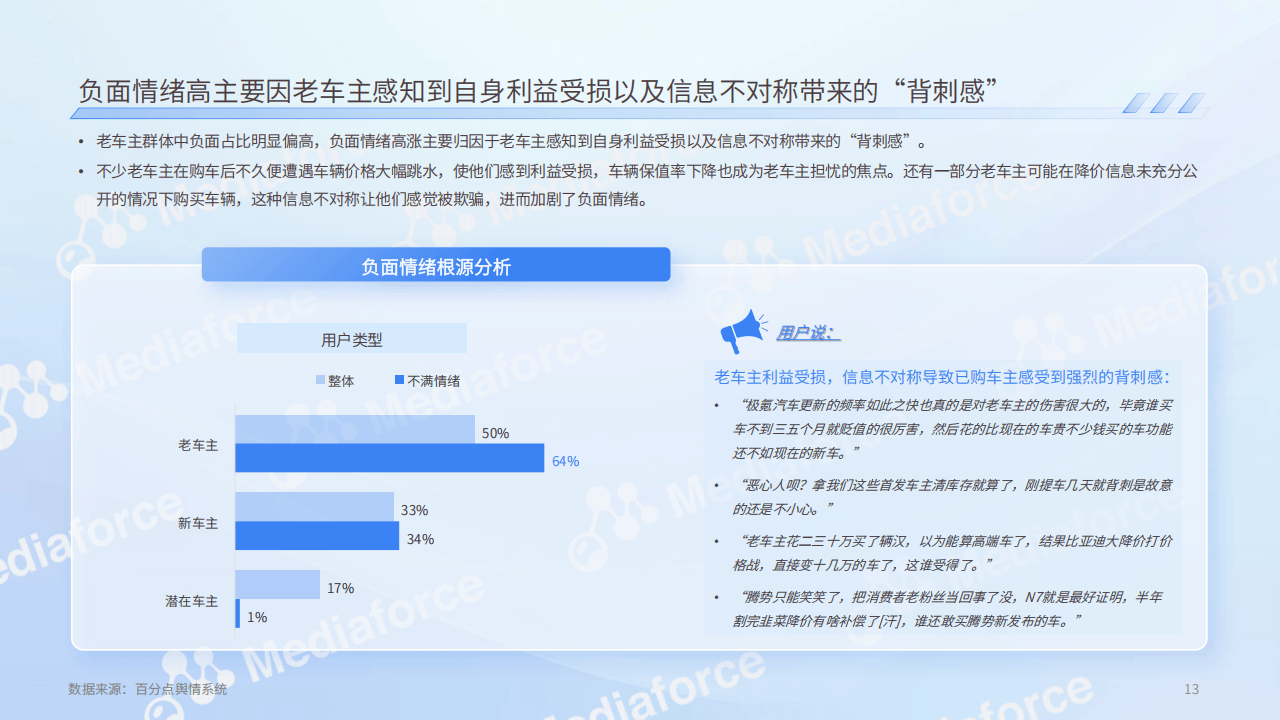 - 价格战感知与态度:消费者认为行业竞争白热化触发价格战,对其情绪影响多元,消极情绪占主导,老车主负面情绪高,因利益受损和信息不对称。