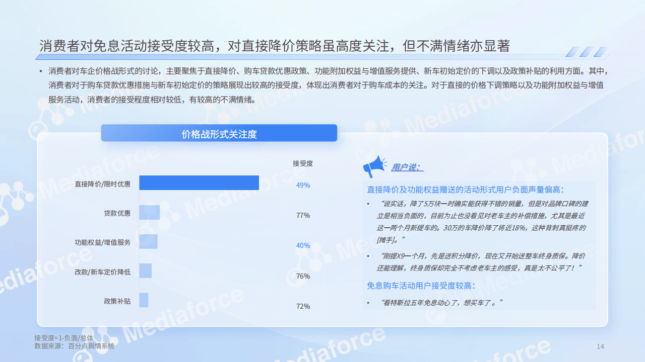 - 对价格战形式关注度与接受度:对免息活动接受度较高,对直接降价关注高但不满情绪显著,对功能权益赠送等活动负面声量偏高。