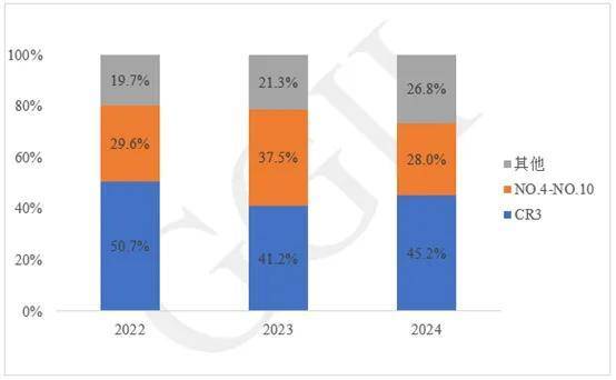 从市场集中度来看,2024年国内燃料电池系统装机量的前三强企业占据了45.2%的市场份额,与上一年相比略有提升,显示出头部企业稳固的市场地位。然而,第二梯队(即排名第四至第十的企业)的市场份额却出现了同比下滑,这主要是由于燃料电池国企在市场推广方面的步伐显著放缓。整体来看,随着新参与者的不断增加和产品的陆续出货,燃料电池市场的集中度呈现出下降的趋势。