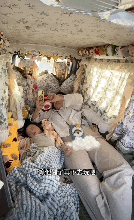 周末带娃去湖边露营,孩子玩累了直接在车里睡觉。