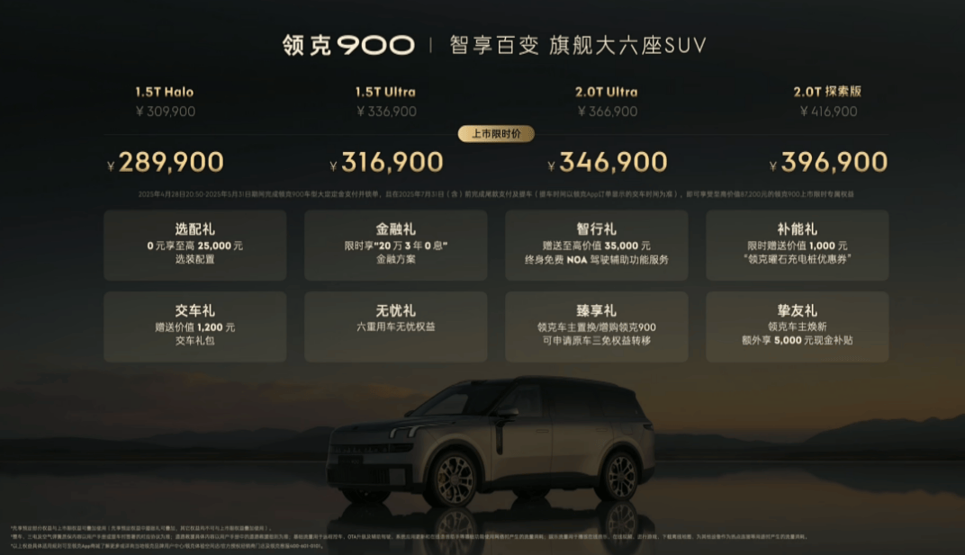 2025年4月28日晚间,领克旗下全新大型SUV——领克900正式上市,新车推出4个车款供选,官方指导价区间为30.99-41.69万元,在5月31日完成大定的用户还将享受限时领享金10000元和限时置换金10000元,叠加上市权益后的上市限时价为28.99-39.69万元。此外,5月31日前大定锁单并在7月31日前支付尾款的用户还将享受包含选配礼、挚友礼、无忧礼等在内的8项专属上市权益。领克900基于SPA Evo大型电混车专属架构开发,首搭英伟达Thor智驾芯片,采用千里浩瀚H7的智驾方案。