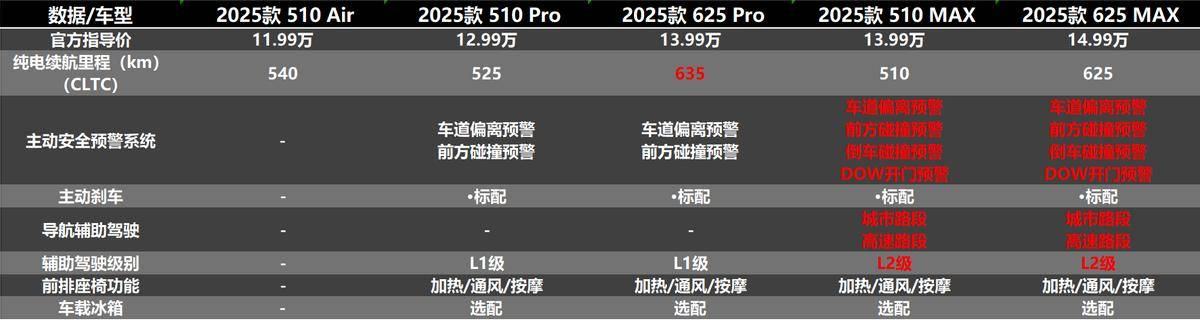 而中配的625 Pro版和510 MAX版的售价均为13.99万元,同时也是天涯君最推荐购买的车型,而这两款车最大的区别就是在续航和智驾方面的区别。