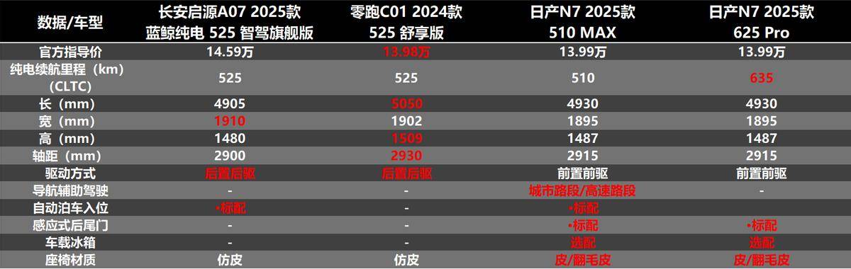 就拿价指导价都在14万元左右,并且都是主销的车型来对比,首先因为日产N7有一个长续航版本可以选,比其他两款车多出了100+km的续航,如果是跑高速的话,就相当于两个服务区的距离。三款车的车身尺寸都差不多,但日产N7是前驱,另外两款车是后驱,所以在驾驶乐趣上,日产N7要略输一筹。