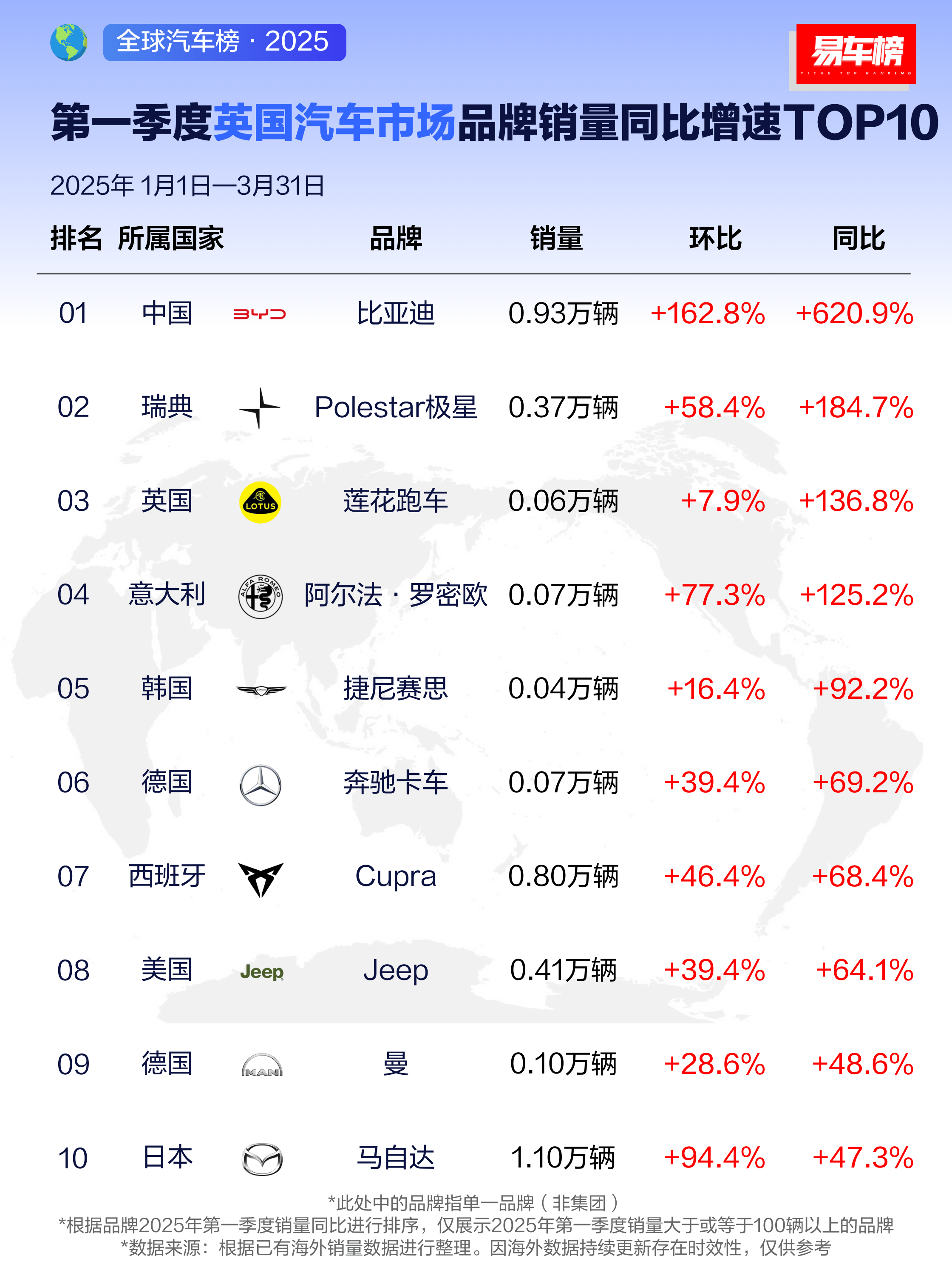 2025年第一季度,比亚迪海外多个市场销量霸榜