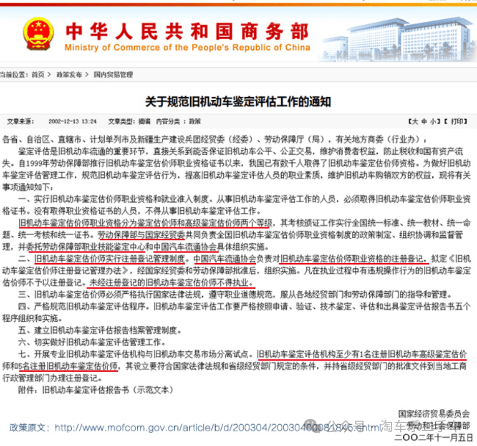 1999年劳动和社会保障部推行设立旧机动车鉴定估价师资格,由当时的劳动保障部和国家经贸委共同制定职业资格制度、监督管理,由劳动保障部职业技能鉴定中心和中国汽车流通协会具体组织实施。