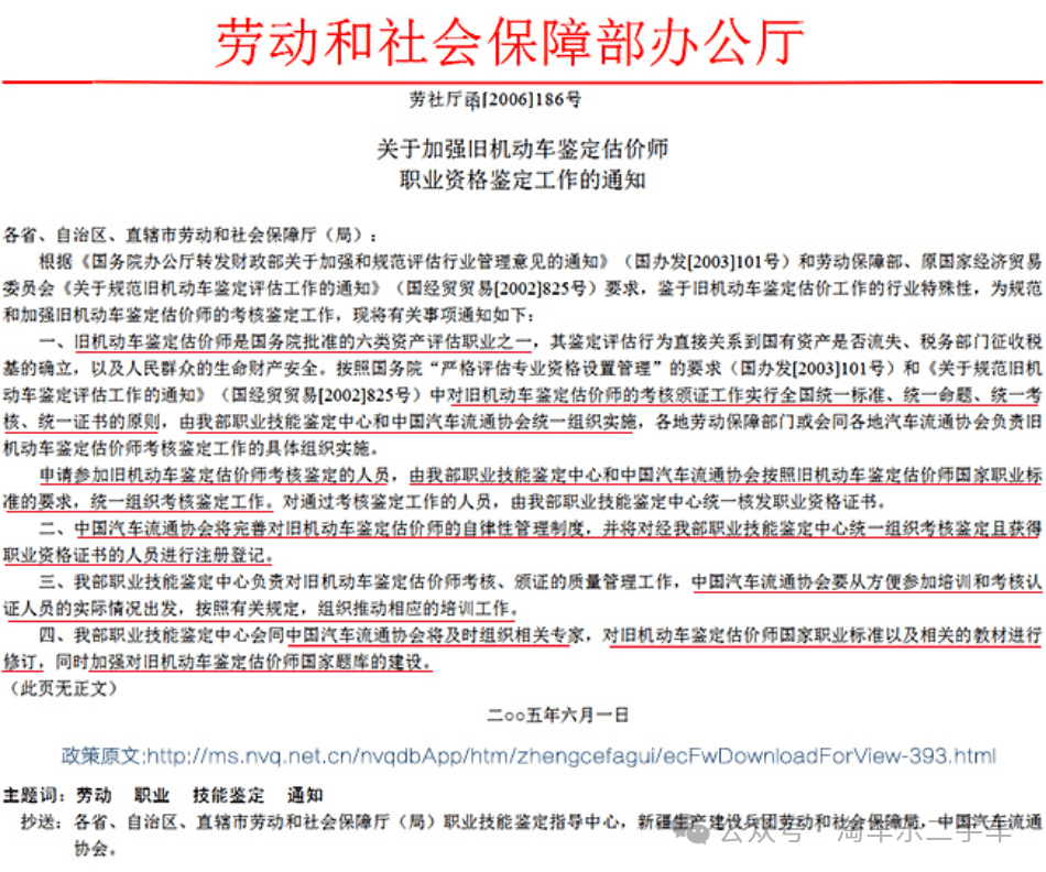 2005年劳动和社会保障部再次发文强调由劳动保障部职业技能鉴定中心和中国汽车流通协会具体组织实施旧机动车鉴定估价师的考核及注册登记工作。