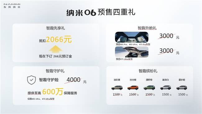 针对预订471 Ultra版本的用户,东风纳米限时免费赠送价值3000元的电动尾门;预订401Pro、401 Ultra、471Pro版本的用户,东风纳米限时免费赠送价值3000元的全景天幕,让用户充分体验到东风纳米06的“智趣”之乐。针对下定Ultra版的用户,东风纳米限时免费提供价值4000元的驾驶辅助险和至高600万的保障服务,让用户后续用车、行车安心无忧。针对用户对车身色彩多样性的需求,东风纳米将油彩黄、扶光橙、漫野绿三类人气车色,限时下定免费送,让更多用户享受到与中国国家地理共创的缤纷色彩。此外,东风纳米还为预定东风纳米06的用户带来了“智趣先享礼”,266元预订金可抵扣2066元,让提前认定东风纳米06的用户享受到来自东风纳米的满满诚意和福利。