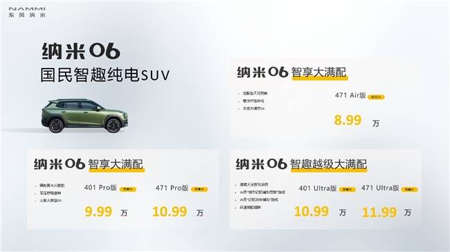 作为致力于让国民玩得起的国民智趣纯电SUV,东风纳米06也在预售期内,带来了诚意满满的福利,让各类“小玩家”们都可以通过东风纳米06实现“大可玩 尽情溜 ”的体验。东风纳米06售价8.99万元起,提供了五款配置,充分满足用户不同方面的需求。除此之外,东风纳米更是为关注东风纳米06的广大用户,带来了价值超1万元的超值“智趣4重礼”,让广大消费者在提前锁定优惠,省心无忧。