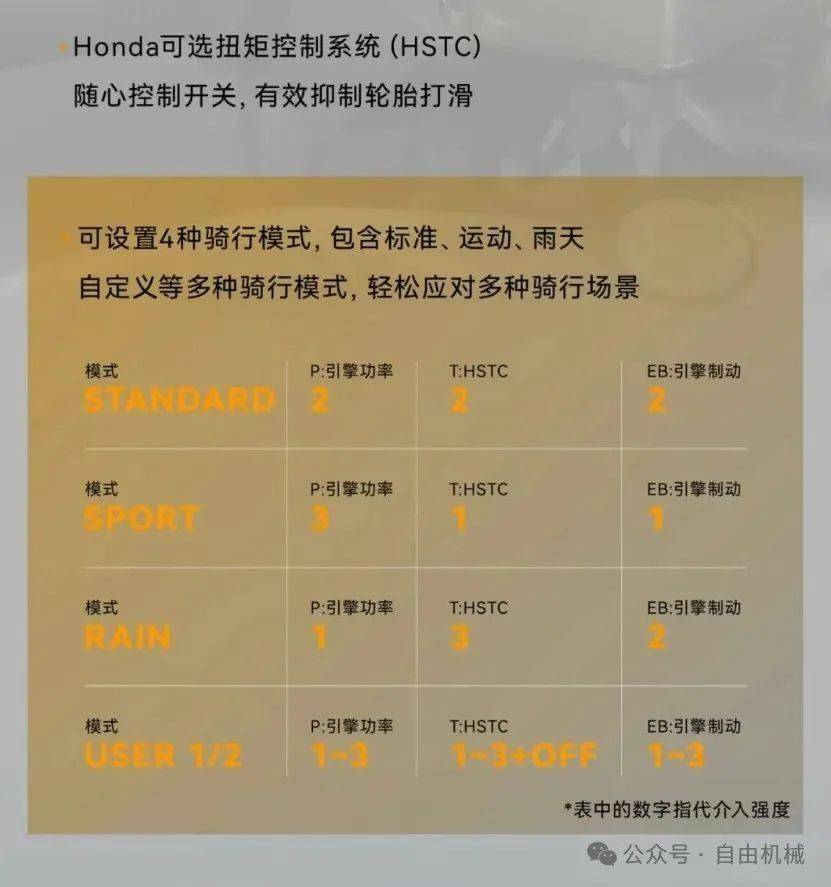 电控系统方面,配备了电子快排、辅助滑动离合,HSTC扭矩控制,发动机制动控制和标准运动雨天自定义四种模式等。