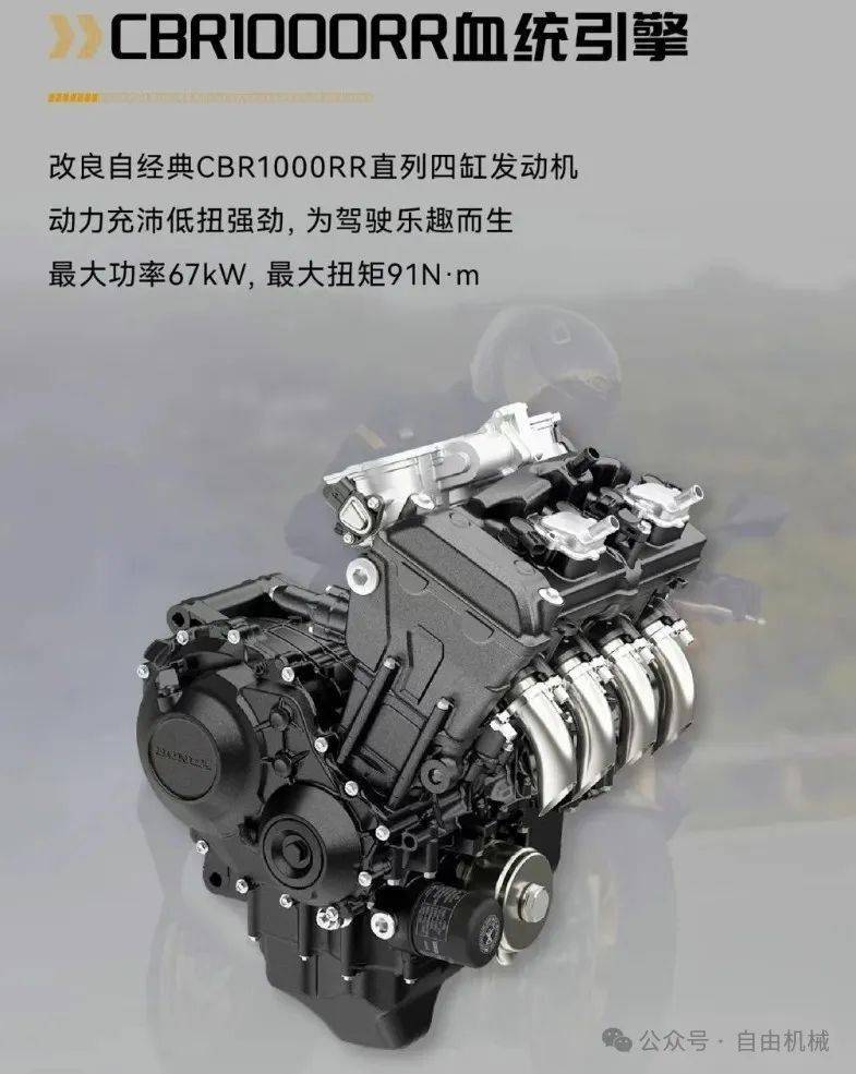 我们先聊聊这台车的发动机,CB 1000 Hornet的发动机采用了源自CBR 1000 RR火刃的动力总成,采用双顶置凸轮轴1000cc直列四缸发动机,海外版的最大功率为111千瓦,在11000转爆发,最大扭矩104牛米,在9000转爆发,国内版为了符合一些相关的环保认证,最大功率限制在67千瓦,在7000转爆发,最大扭矩限制在91牛米,在7000转爆发。