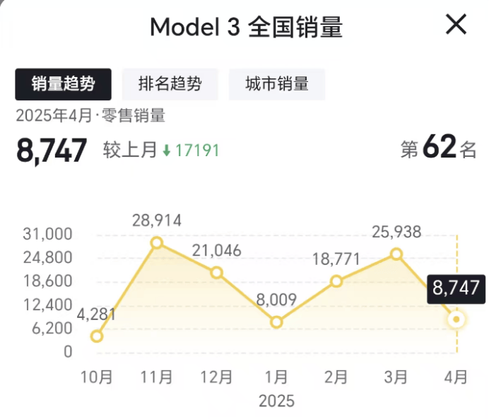 至于后两名,排第四的特斯拉4月销量29561辆,同比下滑-8%,但环比却下滑了接近60%!数据显示,3月份其销量达到72116辆。当月数据上看,4月销量大幅暴跌的原因应该是Model3,国内零售销量只有8747辆。