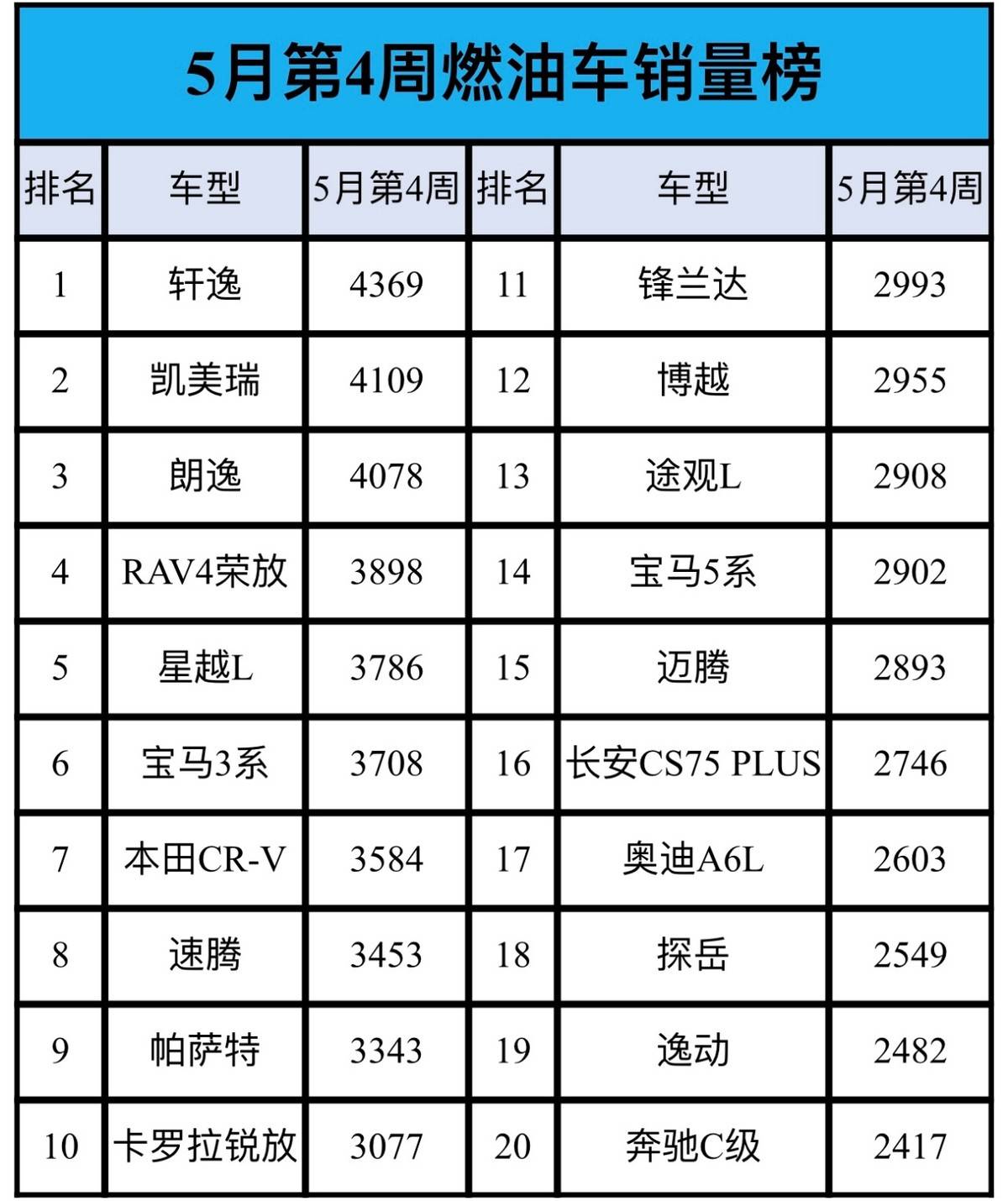 在刚刚过去的5月份第4周,油车市场战况如何?基于乘联会最新数据,共有10款车型销量超3千台,前三甲更是轻松登上4千台大关。看似市场有所回暖,但别高兴的太早,这份榜单几乎已成日系、德系的天下,前十名中的自主品牌只有星越L一棵独苗,显得尤为孤单。