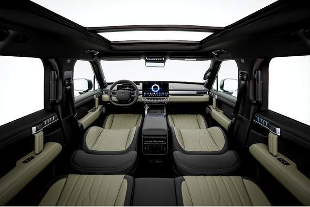 猛士M817座舱横平竖直、中轴对称,搭配金属质感材质,塑造硬朗机甲风格;内饰91.2%软包包覆,包覆面积达32㎡,人体与座椅接触面大面积选用Nappa真皮,皮质细腻,顶棚及后备厢采用高档绒质面料,硬派越野也可触手皆豪华。