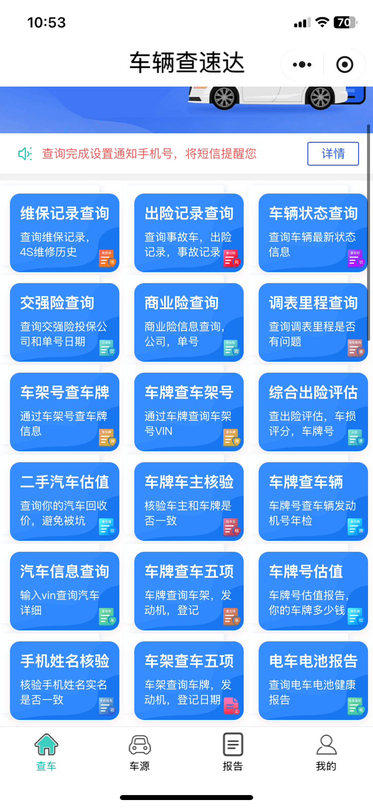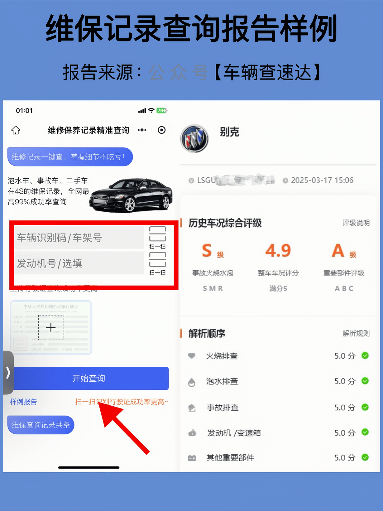 关键提示,平台数据覆盖范围和准确性差异较大,需仔细甄别。此时,【车辆查速达】平台就能成为你的得力助手。我们专注于车辆信息深度查询服务,整合多方权威数据源,致力于为你提供更全面、更值得信赖的维保记录报告。只需关注,通过菜单指引,即可轻松发起查询。