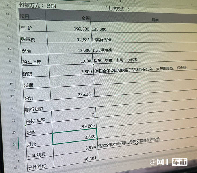 销售:综合落地23.6万。贷款方案是零首付,每个月还3800元左右,一年的利息是5900元。