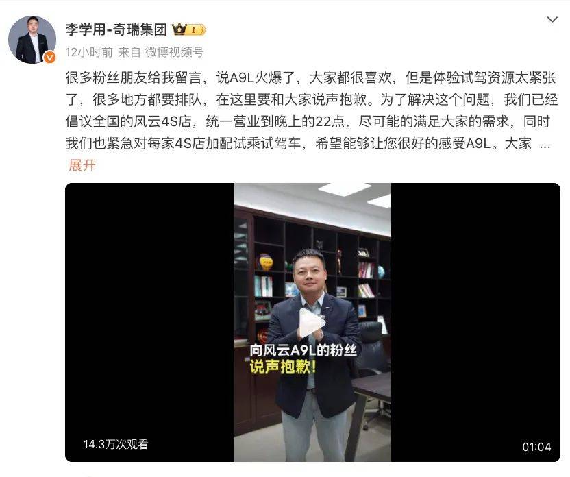 7月18日,奇瑞集团执行副总裁李学用发视频向消费者道歉:“非常对不住大家!”由于原因是风云A9L的火爆,不少消费者吐槽展厅A9L车源紧张,甚至很多区域试驾都要排队。