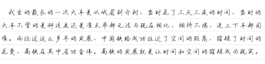 我坐的最长的一次火车是从峨眉到开封,当时花了三天三夜的时间,先从峨眉到成都,然后从成都到西安,在到郑州转车去开封。当时的火车不管的是舒适度还是准点率都无法入现在相比,拥挤不堪,连上下车都困难,很多人都是从窗户上下。而经过这么多年的发展,中国铁路成功拉近了空间的距离,缩短了时间的花费。而这其中就不得不提高铁。